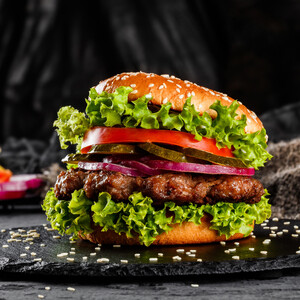 Burger Bun di Semola, 160g di Bovino adulto , insalata gentile, pomodoro, salsa burger, Rustic Fries
