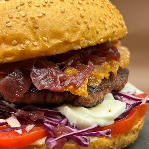 Burger Bun di Semola, 160g di Bovino adulto, scaglie di Parmigiano Reggiano DOP, cipolla caramellata, bacon croccante, pomodoro, cavolo rosso, salsa burger, Rustic Fries