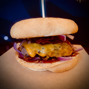 Dentro, 160 g di svizzera di bovino, cheddar fuso, bacon croccante, cipolla rossa fresca e cipolla crispy dorata. Servito con Rustic Fries.