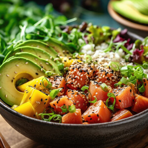 Riso bianco, tartare di tonno, avocado, mango, cetriolo, edamame, granella di pistacchio, mix di semi di sesamo e salsa teriyaki.