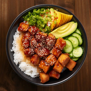 Riso bianco, tofu marinato in crosta di sesamo, edamame, cavolo rosso, wakame, mango, mix di semi di sesamo, maionese sriracha vegana, cipolla croccante.