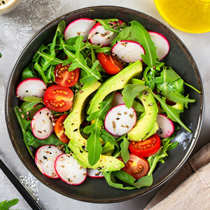 Riso bianco, tartare di salmone, wakame, pomodorini datterino, cavolo rosso, julienne di carote, mandorle tostate, mix di semi di sesamo e salsa teriyaki.
